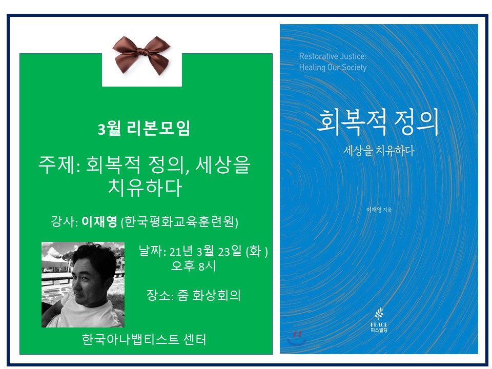한국 회복적 정의운동의 포문을 연, 전 KAC의 평화교육가이시자, 현 한국평화교육훈련원의 이재영 원장님의 신간<회복적 정의, 세상을 치유하다>를 가지고 리본모임을 갖습니다.