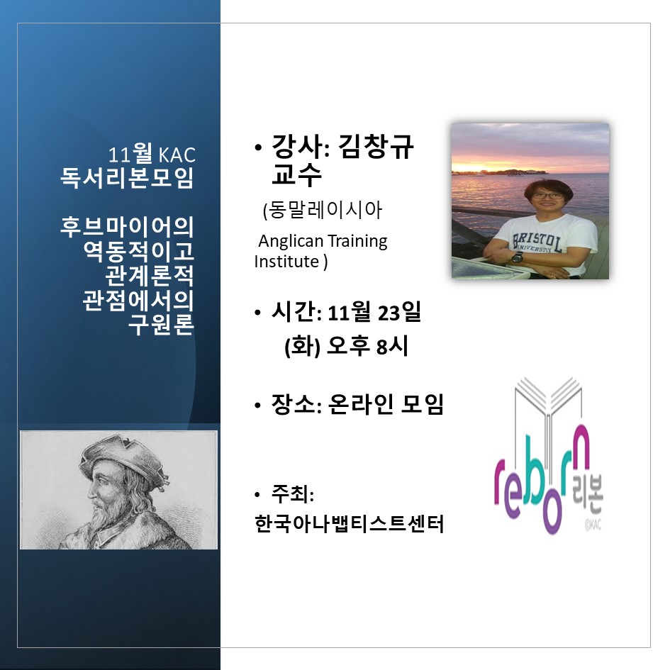 강사 김창규 박사는 영국 브리스톨 대학에서 구원론을 주제로 박사과정을 전공하였습니다. 슈벵크벨트 전공자이자 지도교수이신 Ruth Gouldbourne의 도움으로 아나뱁티즘에 관심을 갖는 계기가 되었고, 후브마이어의 저작물에 대한 연구를 통해 신학박사를 취득하신 분이십니다.