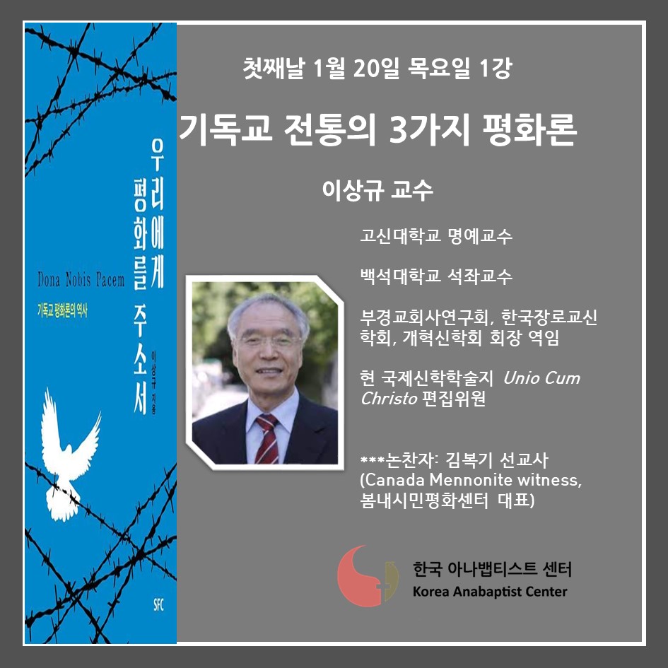 첫날에는 SFC 출판사를 통해 <우리에게 평화를 주소서: 기독교 평화론의 역사>라는 책을 내신 이상규 교수님을 모십니다. 성경에서 발견되는 평화에서 시작하여 초기교회, 중세시대, 종교개혁시대, 계몽주의시대, 근대 및 한국의 평화에 이르기까지 촘촘하게 기독교가 역사 속에서 경험한 평화를 이야기하는 시간이 될 것입니다. 논찬자로서 김복기 캐나다 파송 선교사님이 함께 하여 주십니다. <우리에게 평화를 주소서>를 미리 읽고 오시면 큰 도움이 되실 것입니다.