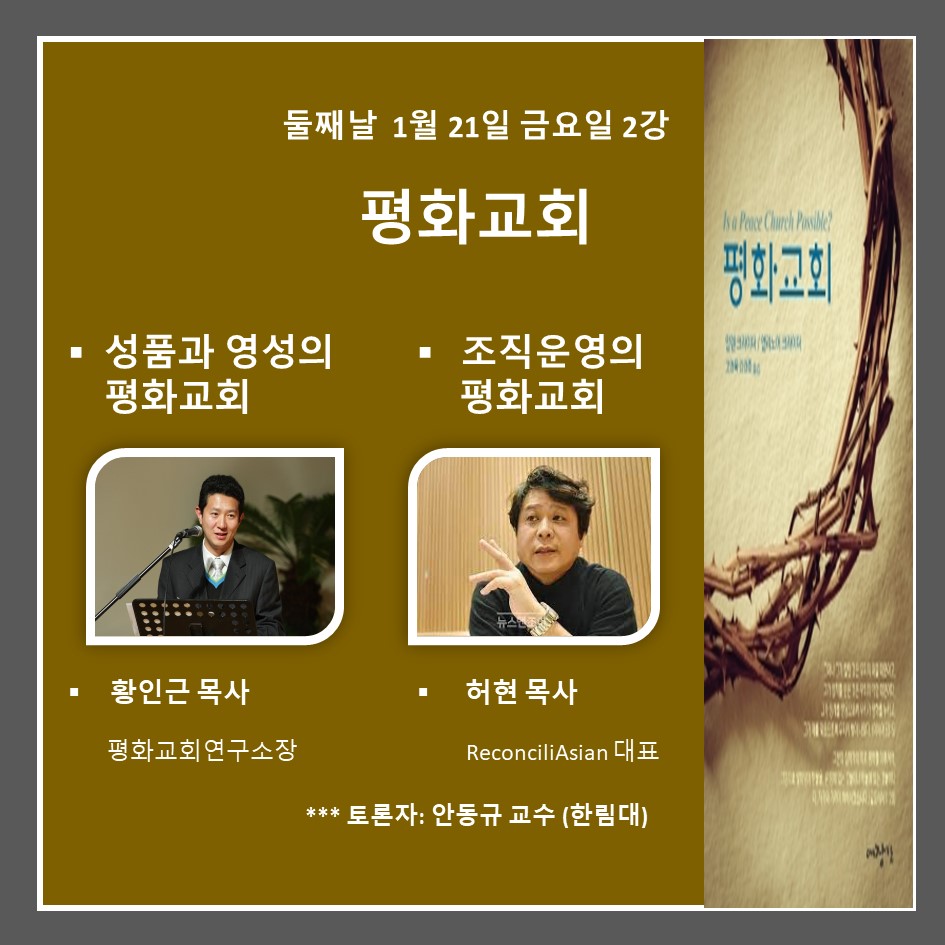 황인근 목사님께서는 영성과 성품으로서의 평화를, 허현 목사님께서는 교회조직과 운영에 있어서의 평화를 나누실 예정입니다.