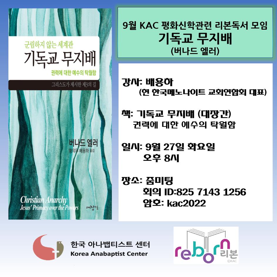 9월에는 미국의 평화주의자이며 형제교회 목사인 버나드 엘러의 글을 통해 군림하지 않는 세계관으로서 <기독교 무지배>에 대한 책을 읽고자합니다.