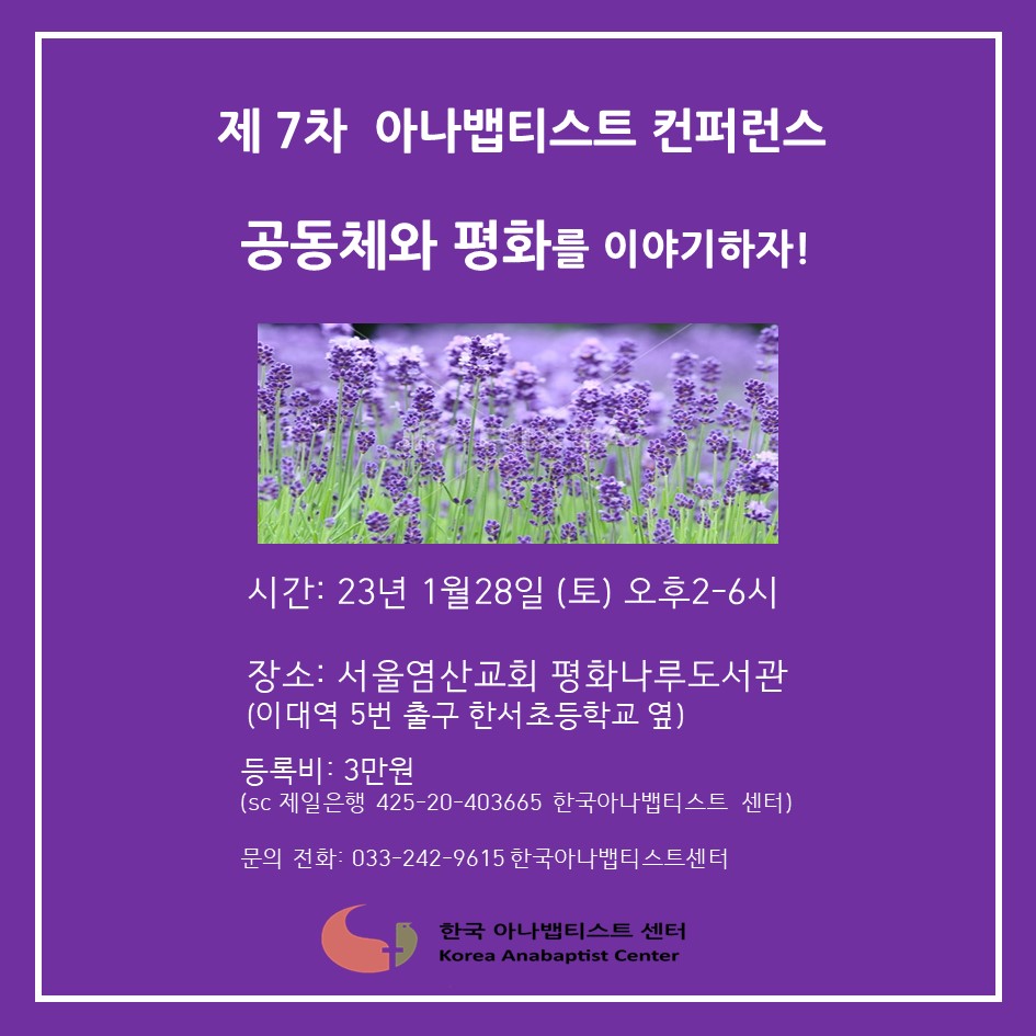 23년 1월 28일에 아나뱁티스트의 신앙을 이야기하는 <<아나뱁티스트 컨퍼런스>> 7번째 모임을 갖습니다. 3년만에 드디어 대면모임으로 모입니다. 얼굴을 맞대어 함께 이야기하는 시간이 그리웠습니다.