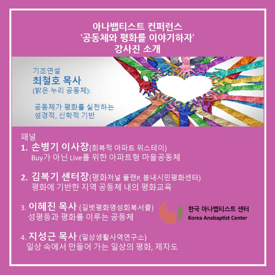 어수선하고 혼란스러운 시기에 어떻게 공동체가 평화를 말하며 살아내야 하는지 생각하고자 합니다. 공동체 내에 평화는 어떻게 적용되어야 하는지에 대한 실제적인 경험자들의 이야기를 들으며 ‘평화와 공동체’를 접목시키는 이야기’로 <2023년 아나뱁티스트 컨퍼런스>를 진행하고자 합니다. 컨퍼런스를 통해 평화를 살아내는 공동체와 삶에 대한 목마름이 있는 분들에게 갈증해소를 위한 한 방울의 생수가 되면 좋겠습니다.