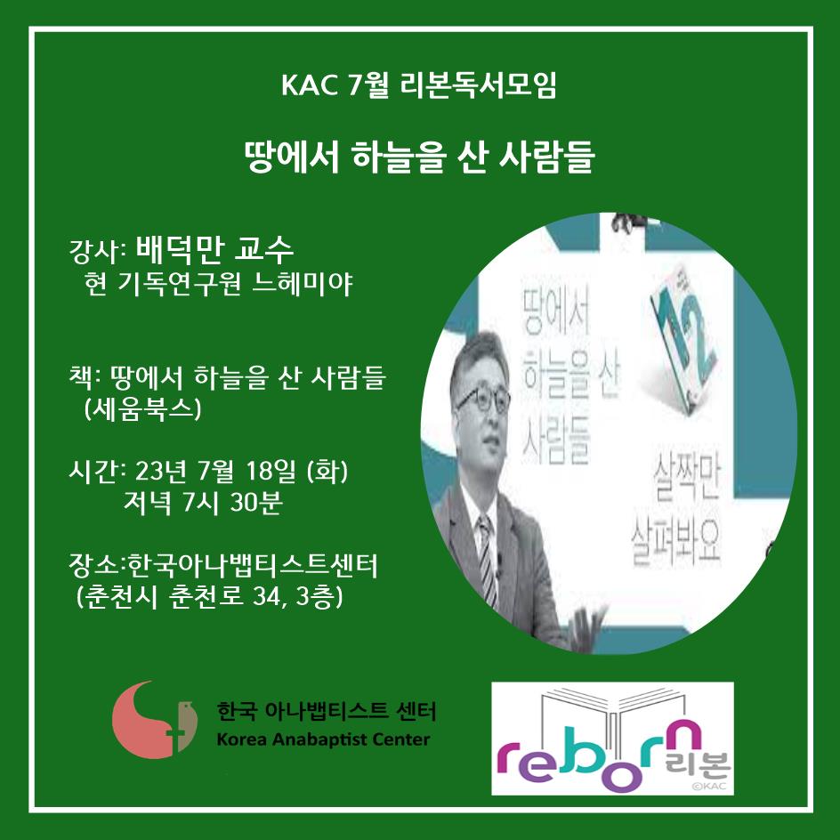 기독연구원 느헤미야의 배덕만 교수님이 춘천을 방문하시는 기회를 이용하여 최근 신간 <땅에서 하늘을 산 사람들>이라는 책을 가지고 삶과 신앙에 관한 이야기를 나누고자 합니다.
