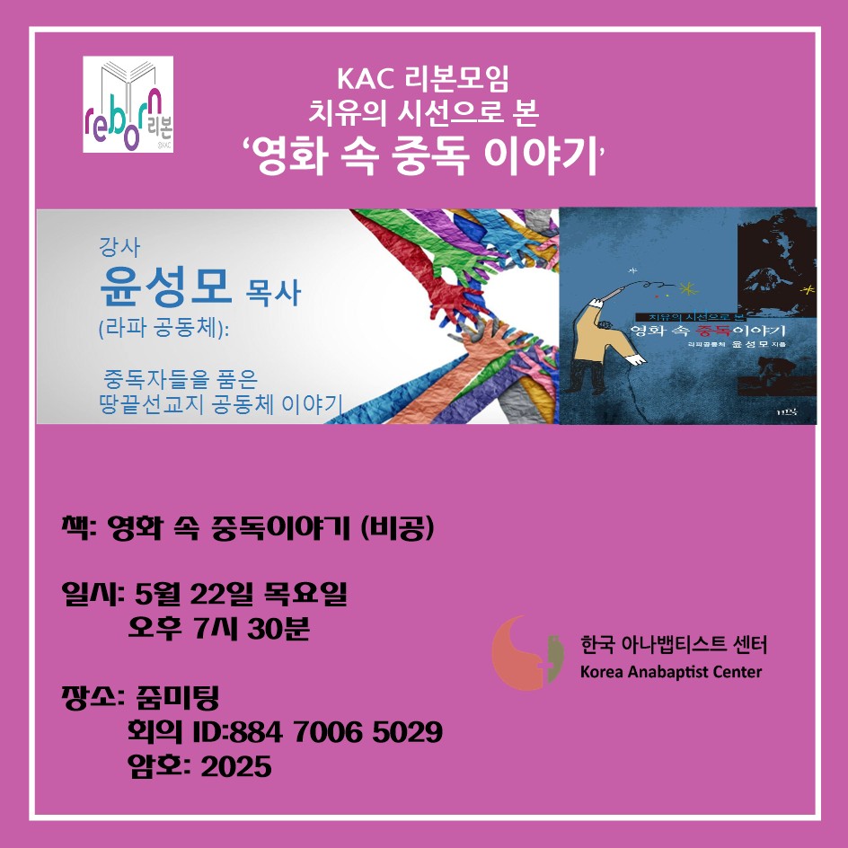 KAC는 5월 리본모임에 인생을 중독자들의 치유를 위해 헌신하신 ‘윤성모 목사님’을 모십니다.